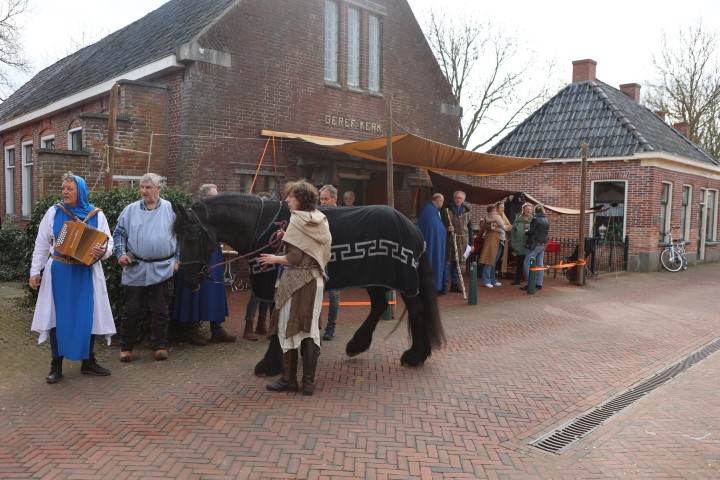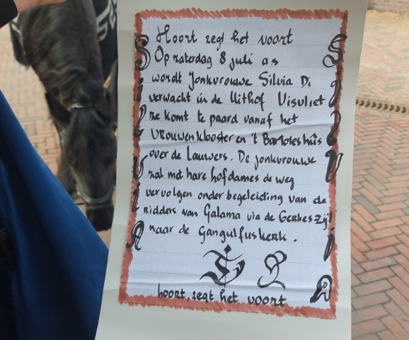 ze komt te paard vanaf het Vrouwenklooster en ’t Bartoleshûs over de Lauwers. De Jonkvrouwe zal met haar hofdames de weg vervolgen onder begeleiding van de Ridders van Galama via de Gerkeszijl naar de Galgulfuskerk. Hoort, zegt het voort.