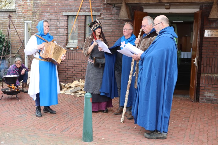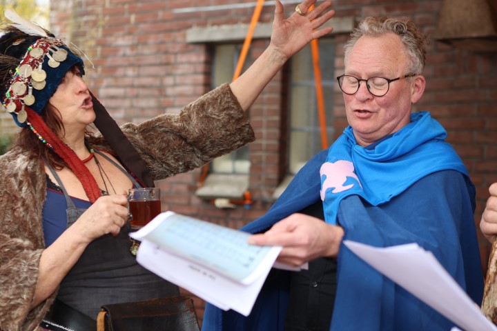 Ook werd er door het koor nog even in stijl gezongen. en werd door de “dorpsomroeper” het grote middeleeuws feest op 8 juli aangekondigd met de volgende woorden.