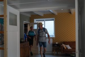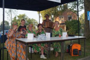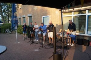 De tocht ging zo verder via Haringhuizen (waar de zonnewijzer en de zon er ook weer mooi bijlagen) zo door naar het Bartoleshûs, hier stonden toiletten voor de wandelaars, een EHBO post en vooral een van de zegelposten. Hier stonden vier dames klaar geheel in stijl om alle wandelaars van een stikkerzegel te voorzien. Ook werden de wandelaars getrakteerd op een stukje muziek van de groep Mosterd na de Maaltijd. Verder kon men hier koffie en of thee krijgen. Vele wandelaars hebben hier even een kleine stop gemaakt.