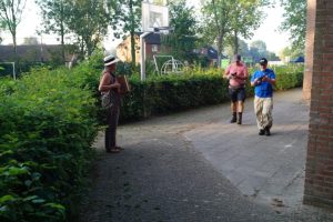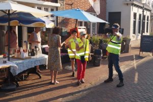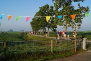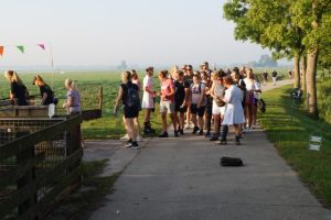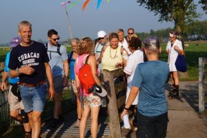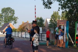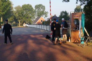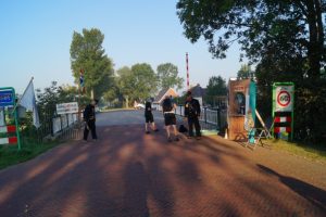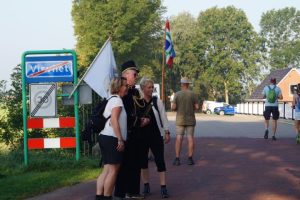 Op de hoek van de Bartolesstraat werden de wandelaars opgewacht door het duo Jan en Julita “take de Wave” die de wandelaars ook toezongen. Dan via de Eise Eisingastraat waar toch nog even extra aandacht werd gevraagd bij het herinneringshuisje. Zo door naar de Friesebrug. Dit was voor sommige wandelaars wel een uitdaging want hier moest de Friese grens worden gepasseerd. Twee veldwachters stonden de wandelaars op te wachten en regelmatig werd er een voor controle tussen uitgepikt. Die kreeg bij het wachthokje een extra inspectie. Mocht dat alles goed zijn kregen ze een certificaat mee om de grens te passeren. Op alles werd gecontroleerd, zo was er zelfs een drugs hond aanwezig, om zo te voorkomen dat met wat voor poerder dan ook de grens over gingen. Naar verluid hebben de meeste deelnemers de grens zonder kleerscheuren de grens gepasseerd. Ook reed nog een veldwachter door ons dorp, om te kijken of alles ordelijk verloopt.