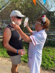 Daarna konden de deelnemers door naar Visvliet om zo via de omloop naar Haringhuizen te gaan. Bij de ingang van ons dorp stonden twee zusters hem op te wachten voor een onderzoekje of om mentaal hulp te verlenen. Het maakte de zusters niet uit wat ze in moesten ondersteunen. Dan werd dit omlijst door wandelmuziek.